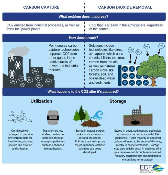 Carbon removal and carbon capture both collect CO2 that then needs to be stored or utilized in some other way.