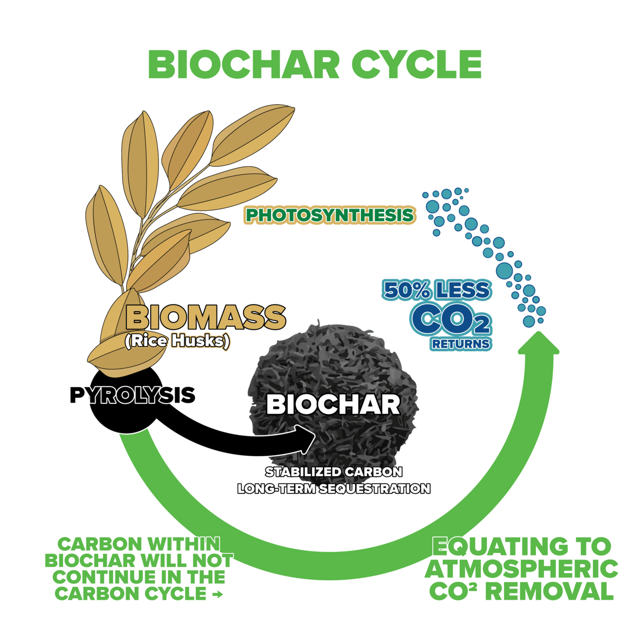 After it is created, biochar is added to soil to sequester carbon and improve fertility.