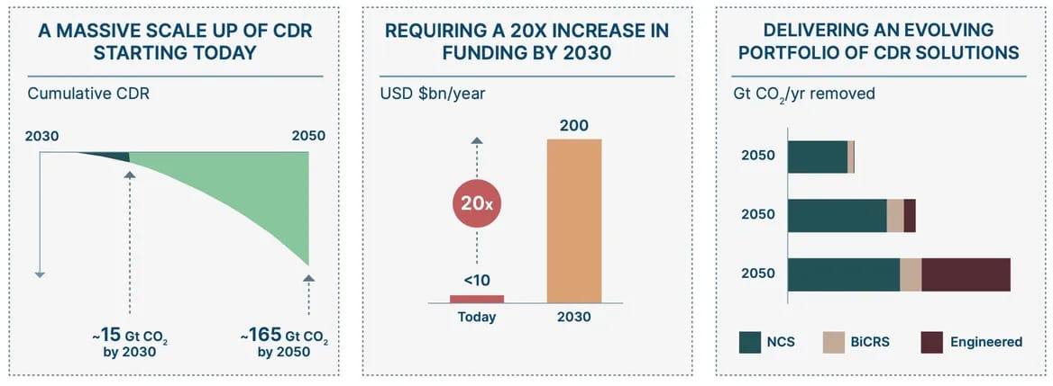 A new report estimated that investments in carbon removal technology will need to increase from less than $10B annually today to more than $200B per year by 2030 if the carbon removal sector is to make a difference on global warming. (CDR in the image below refers to Carbon Dioxide Removal)