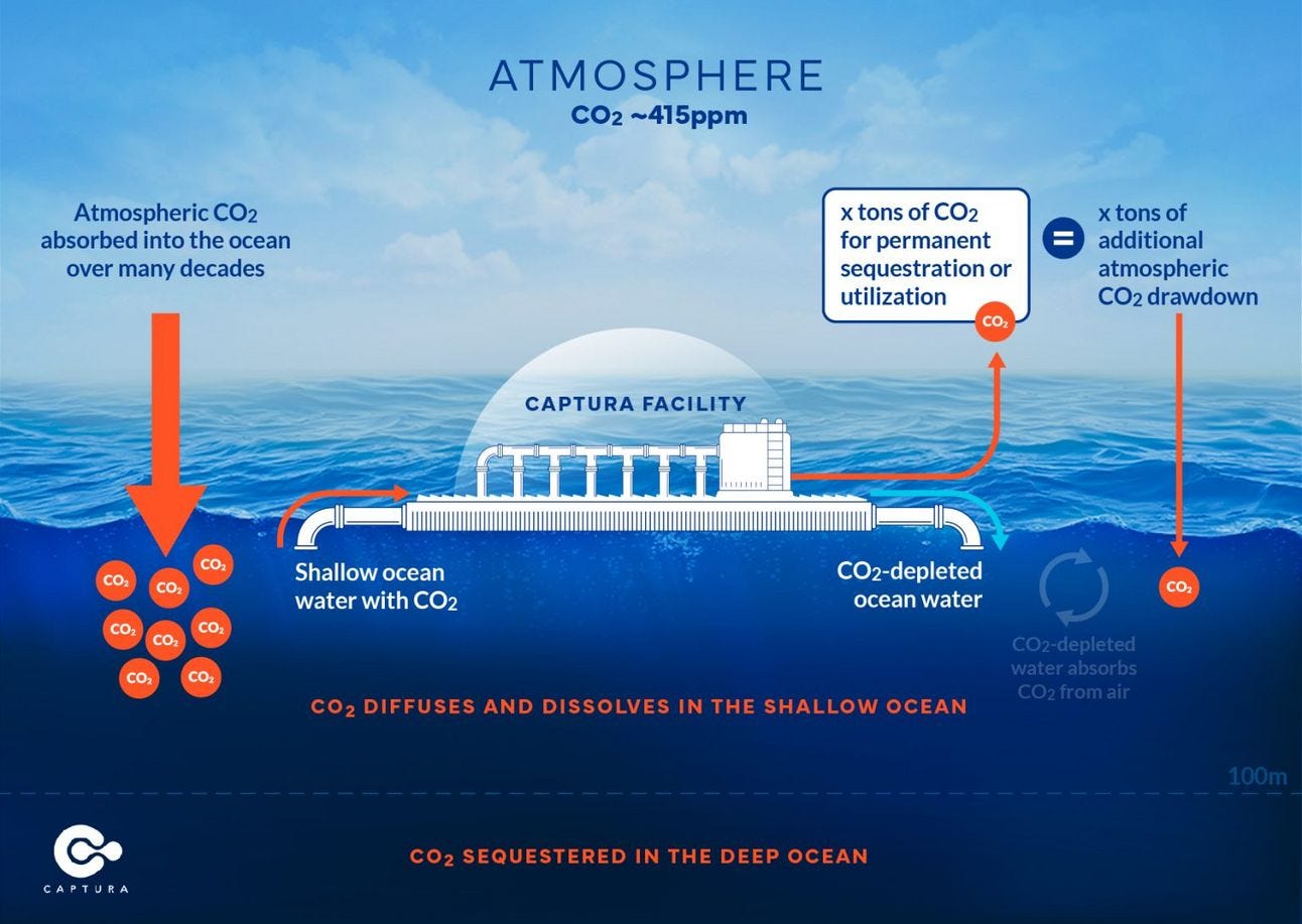 A graphic explaining direct ocean capture from Captura, a Californian startup that is building the world’s biggest direct ocean capture facility for Canada.
